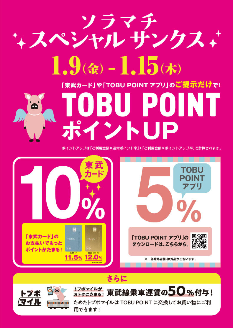 東武カードのご提示で10%、TOBU POINTアプリご提示で5%にポイントアップします!