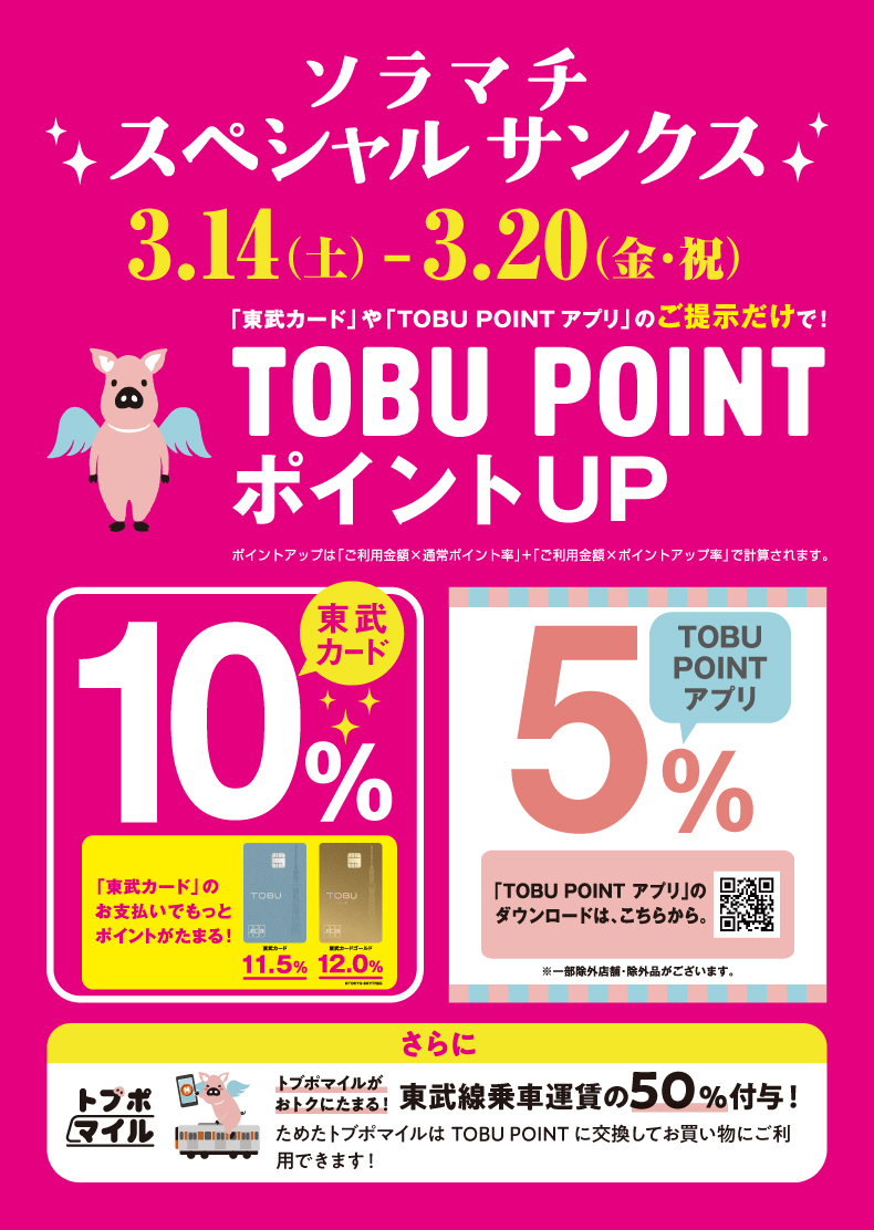 東武カードのご提示で10%、TOBU POINTアプリご提示で5%にポイントアップします!