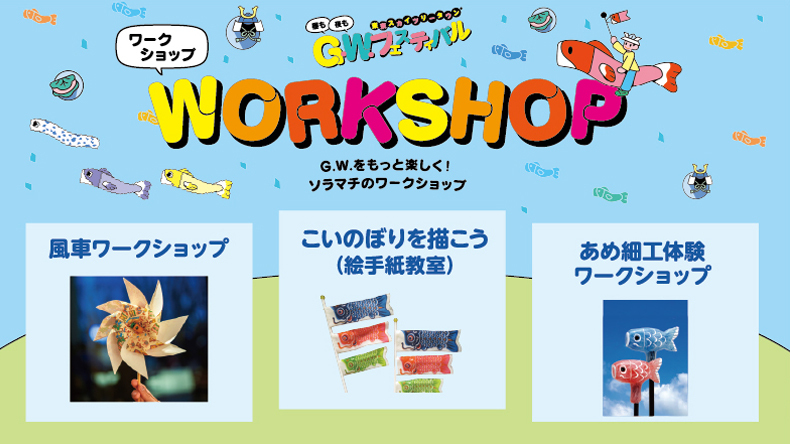 In addition to workshops related to koinobori, we will hold workshops that can be enjoyed not only by children but also by adults, such as handmade experiences of kami-sashimi confectionery and food sample production.