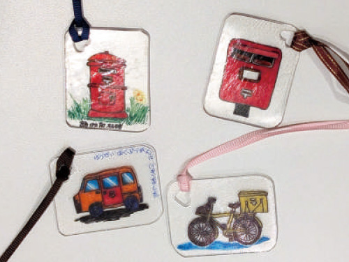 We'll draw pictures of postal-related items such as mailboxes and postal delivery motorcycles on plastic sheets to make name tag charms.