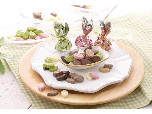 Chocolate "Leaf Memory" in the form of a small tree leaf. The colorful chocolates wrapped in a small drawstring pouch have been a long-selling product for over 35 years. mon loire aims to be a "heartwarming, memorable" chocolate shop.