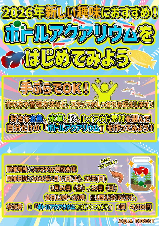 Although the store is small, it has a wide selection of equipment, including popular ADA products. We have over 200 types of tropical fish, mainly small beautiful fish such as characins and corydoras, and over 150 types of aquatic plants, from aquarium plants to moss and ferns for terrariums. We also respond to various requests such as aquarium maintenance and leasing. If you want to start an aquarium, or if you want to start but don't know how to raise them, please feel free to contact us or visit us. Our staff will assist you with kindness and care.