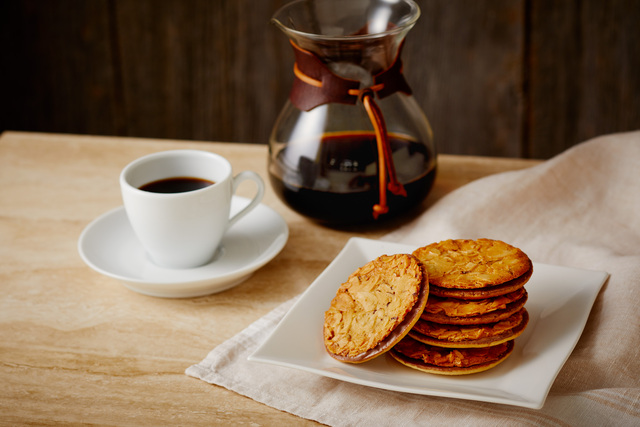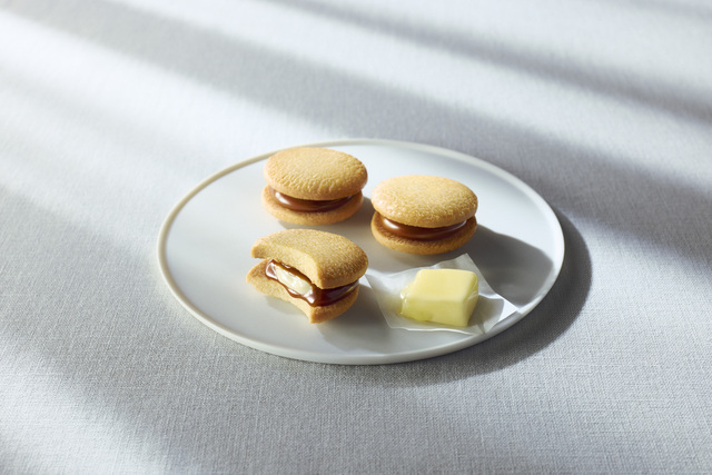 This is a luxurious sandwich cookie with soft, melty caramel butter oozing out from between light and crispy sable cookies.