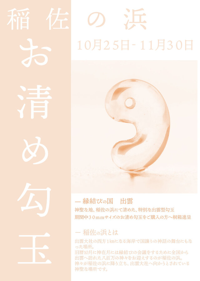 We will be selling magatama beads that have been purified at Inasa Beach in Izumo, the land of the gods, for a limited time and in limited quantities.