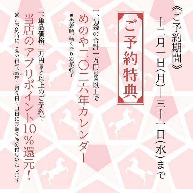 We are now accepting reservations for the 2026 Lucky Lucky Bag! As a special pre-order bonus, if you spend over 10,000 yen on the lucky bag, you will receive a free Menoya 2025 calendar! (While supplies last)