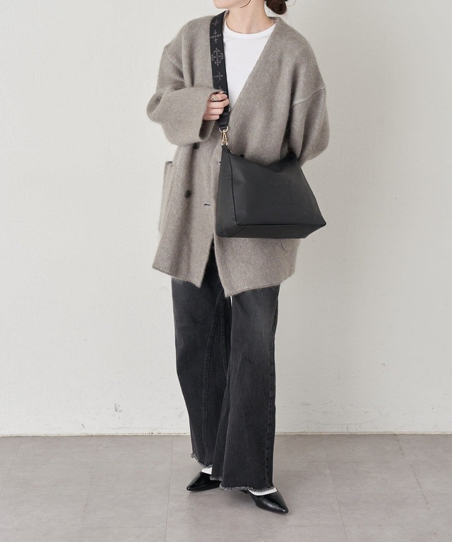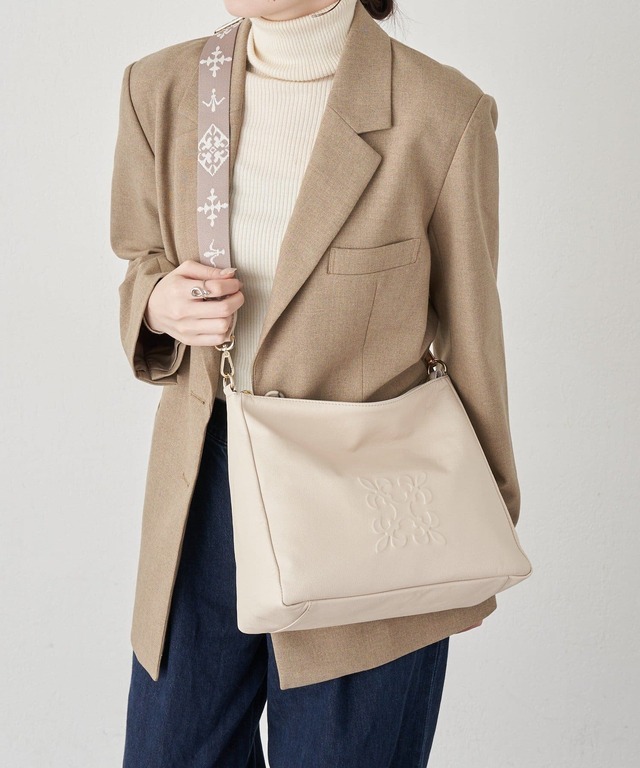 The three-dimensional embossed monogram and shoulder strap add a subtle touch of elegance to a simple outfit!